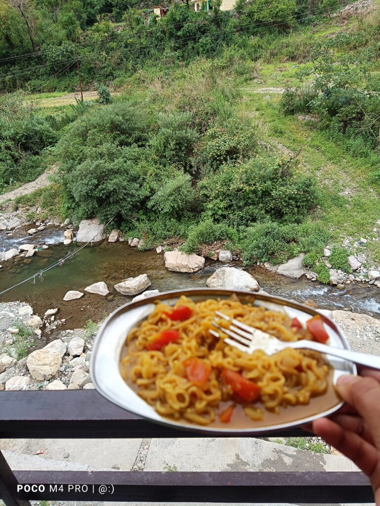 After some time, the bus stopped at a small pahadi dhaba. I stepped out, thinking I should eat something. I saw Maggie on the menu and thought, why not complete my dream of having Maggie in the mountains (Pahado wali Maggie)? I decided to order it and enjoyed every bite with all my heart, feeling happy about ticking something off my small bucket list.